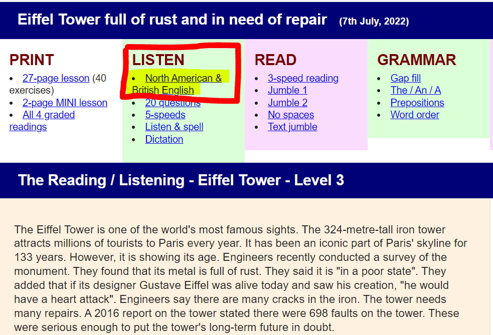 因為這個網頁是英國網站, 所以文章採用的是英文,聽力的部分英文會比較簡單易懂因為是專業的老師念的,字句比較清晰,北美口音會比較快比較糊,就是一般人說話的方式。