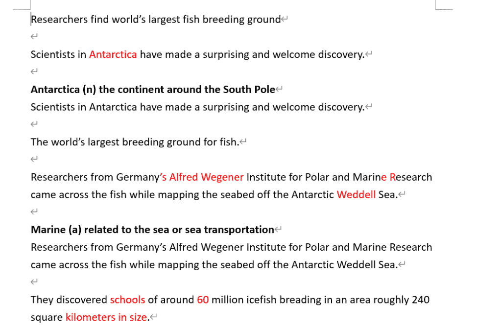 - 比對打出來的句子跟原文的差異,將錯誤和不認識的單字用紅色標記出來。請一定要仔細比對!這樣你才能知道自己語法的慣性錯誤和更了解英文的慣用語