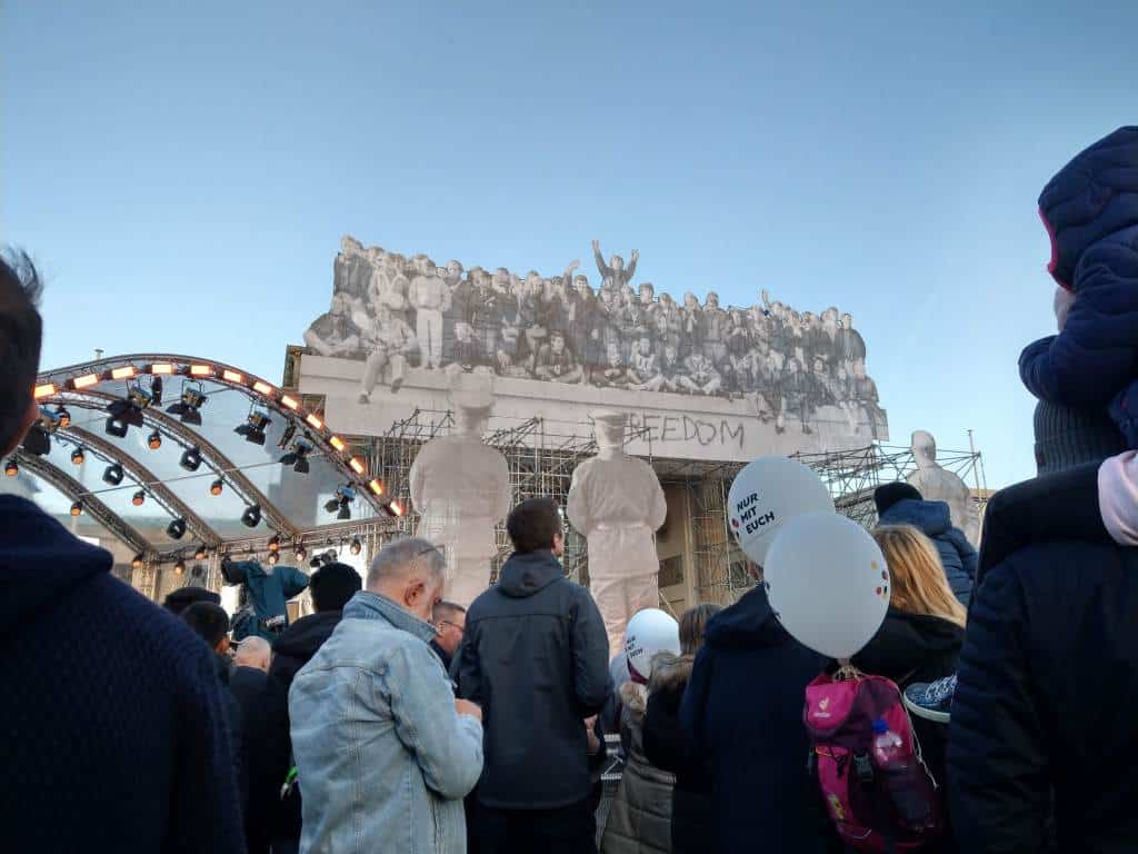 2018年德國統一紀念日橫掛在布蘭登堡大門上的主視覺,是一群在圍牆上歡欣鼓舞的青年人們。不知道見證了那刻的人們如今在何方?那是個振奮人心的時刻,但是時光飛逝,要傳承給下一代的過往,究竟是怎麼樣的重擔。
