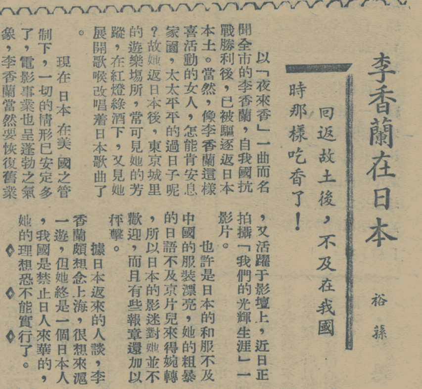 在日本人眼中是日本人,在中國人眼中是中國人,使影迷也不禁好奇她究竟是哪裏人,問:李香蘭究竟是日本人,是滿洲人?似乎中國影迷已經隱隱覺得能受日本政府吹捧的,不可能是中國人。