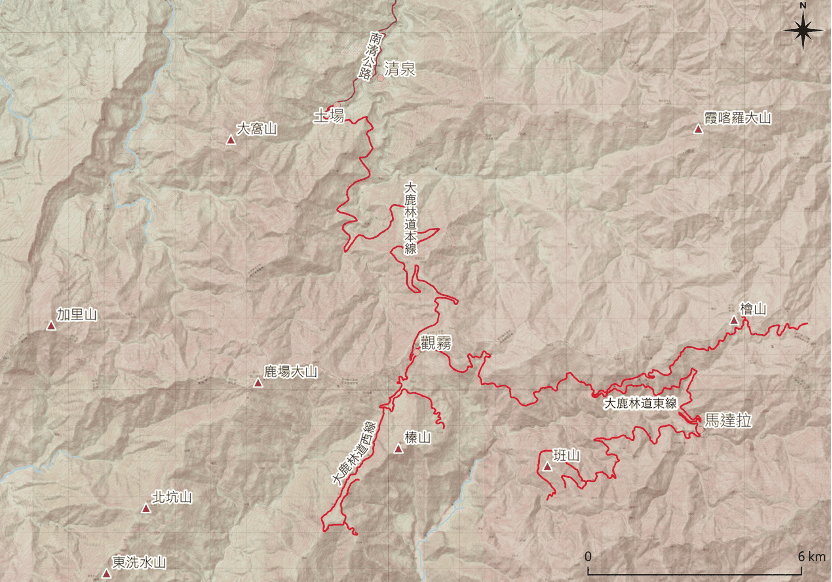 大鹿林道連接原有的南清公路,自日本時期即有的土場向觀霧延伸,目前主幹道從土場至觀霧約有27公里。除主幹外還有東線、東支線與西線,各自朝三個方向延伸。