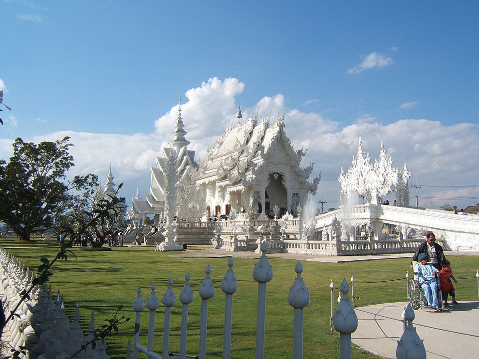 位於清萊的 班隆坤村,白廟被視為近代最美的寺廟之一,由泰國藝術家 Chaloemchai Khositphiphat(許龍才) 親自打造。整座寺廟以純白色象徵純潔,並以 玻璃馬賽克點綴,陽光下閃耀如淨土。