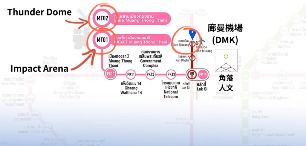 其實只要記得搭到 捷運粉紅線 (MT01) IMPACT Muang Thong Thani (要去 Impact Arena 的人) 和 (MT02) Lake Muang Thong Thani (要去 Thunder Dome 的人)即可。