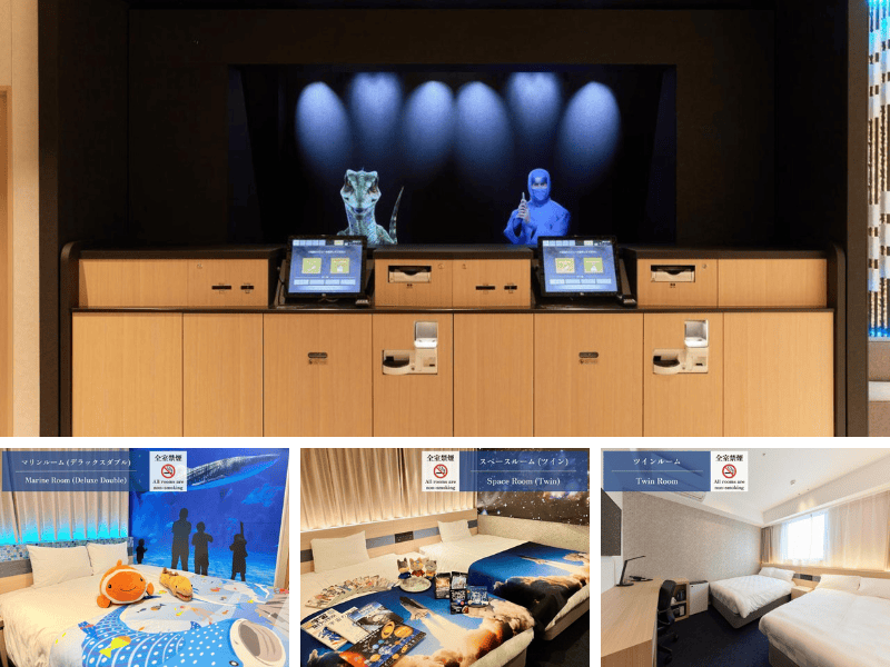 飯店大廳設置有恐龍、忍者等主題角色自助櫃台,以有趣又新奇的方式迎接旅客,讓住宿充滿驚喜感,特別受到親子與年輕旅客的喜愛。