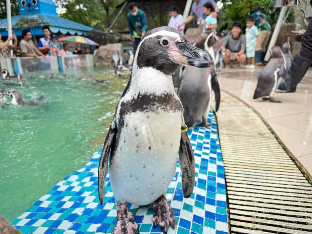除了能看到大象游泳外,綠山動物園每天也會有企鵝遊行的活動。由工作人員帶著一排排的企鵝和遊客見面互動。