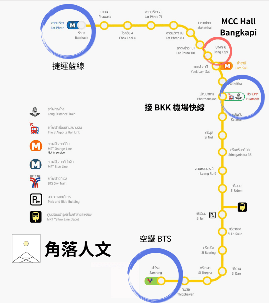 搭到 Lat Phrao 站轉乘 捷運黃線 ,從 Sukhumvit 站出發車程約 60 分鐘。