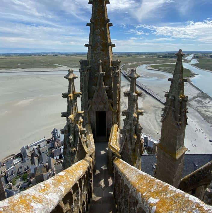 從修道院往上走,會到達戶外的修道院階梯,在這裡的至高點可以看到聖米歇爾山的村莊、環繞聖米歇爾山的海景,和修道院上半部的建築尖塔群。