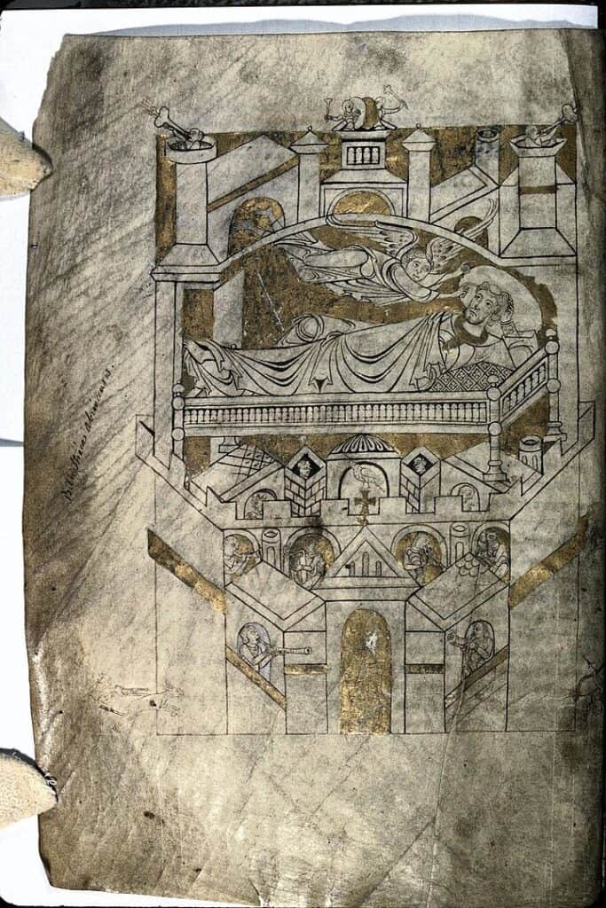 8 世紀時,在聖米歇爾山附近的 阿夫朗什鎮 Avranches,該地的主教宣稱 聖天使米迦勒 3 次出現在他的夢中,要求他在附近海邊小島的最高點蓋一座教堂,這座海邊小島便是 聖米歇爾山。