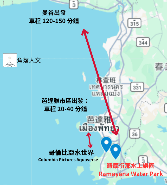 芭達雅市區、曼谷、羅摩衍那水上樂園、哥倫比亞水世界 相對位置&交通時間