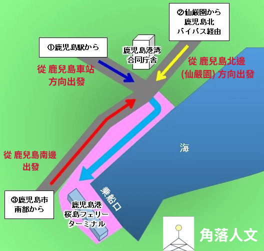 - 搭乘 City View 觀光巴士 的話,在 鹿兒島水族館前 站下車,一下車就到櫻島渡輪碼頭了。