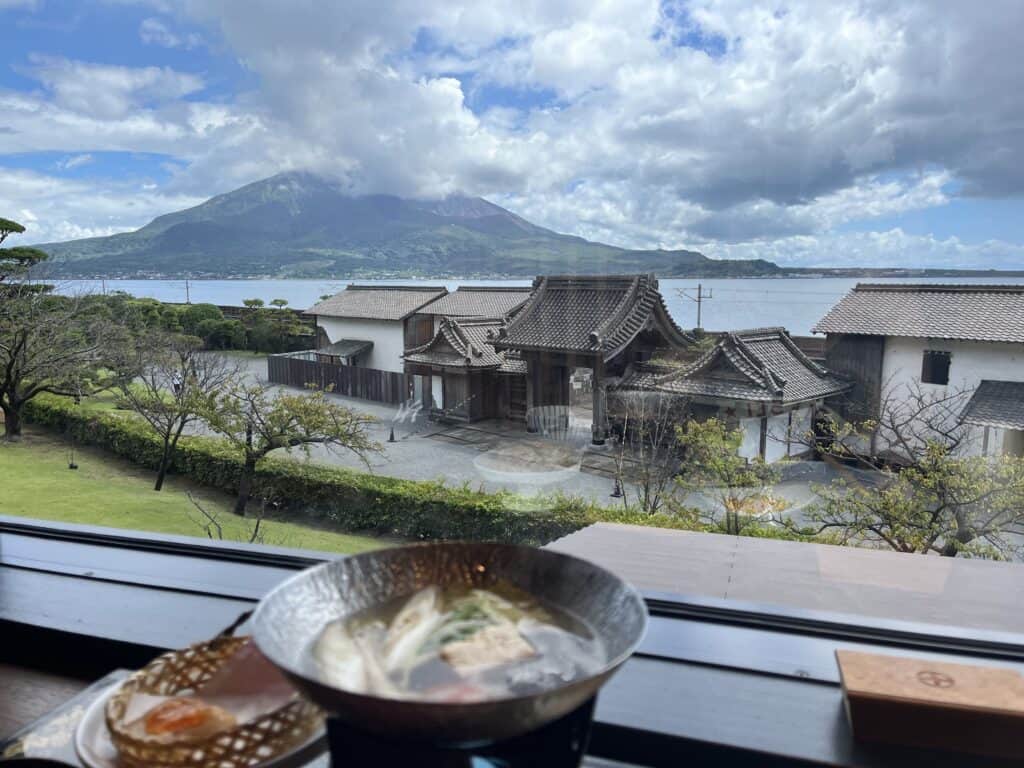 我點的黑豬火鍋套餐 分量足夠、精緻,價格也 ok。特別喜歡這裡的座位,因為可以一邊吃飯一邊看櫻島。比較可惜的是那時候去冷氣太強,我點的火鍋一直沒煮開 XD,影響了用餐體驗。建議入座的時候可以觀察一下冷氣的位置。