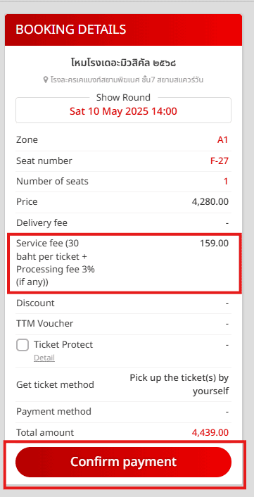 接著就可以確認結帳,要注意的是在 Thaiticketmajor 購票除了原票價外,需要加一筆服務費,所以最後的結帳金額會比票價還要高個幾百泰銖。