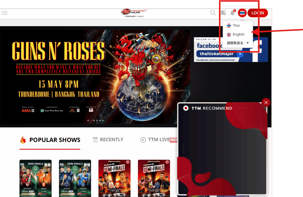 進入 ThaiTicketMajor 首頁, 在右上角的地方選擇英文