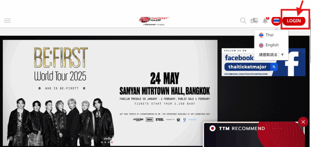 - 進入 ThaiTicketMajor 首頁, 選擇 ” Login 登入”