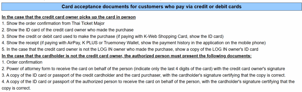 演出場館當天會開放現場取票,最晚演出前 1 小時要完成取票;此外也可以到 ThaiTicketMajor 在曼谷的 11 個售票點(ThaiTicketMajor outlet) 先行取票,最晚須於演出首日 7-10 天前完成,實際領取期限會寫在購票證明上。
