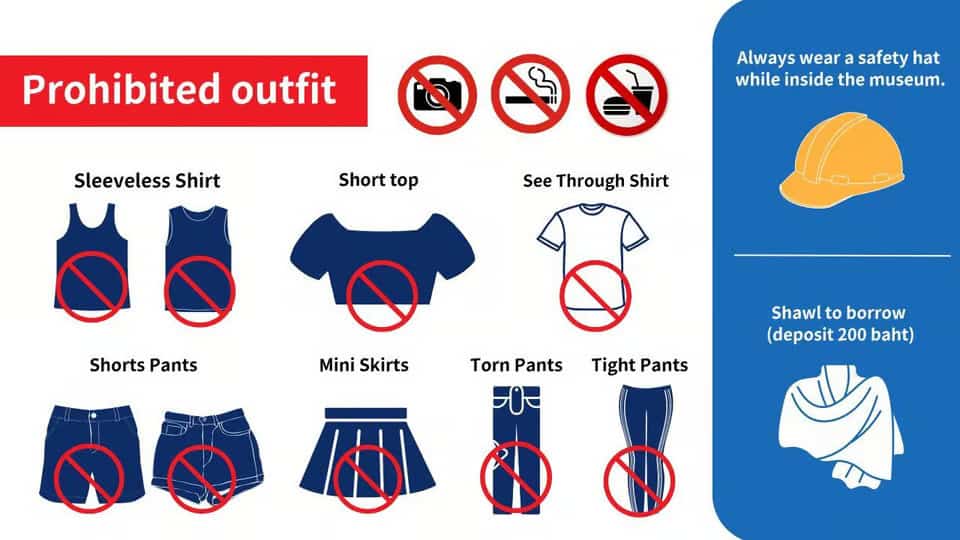 2. 需穿著有袖的衣服,不得穿短褲、背心、短裙等。現場可以租披肩,須付 200 泰銖押金。
