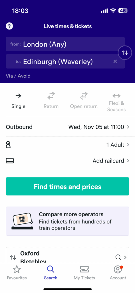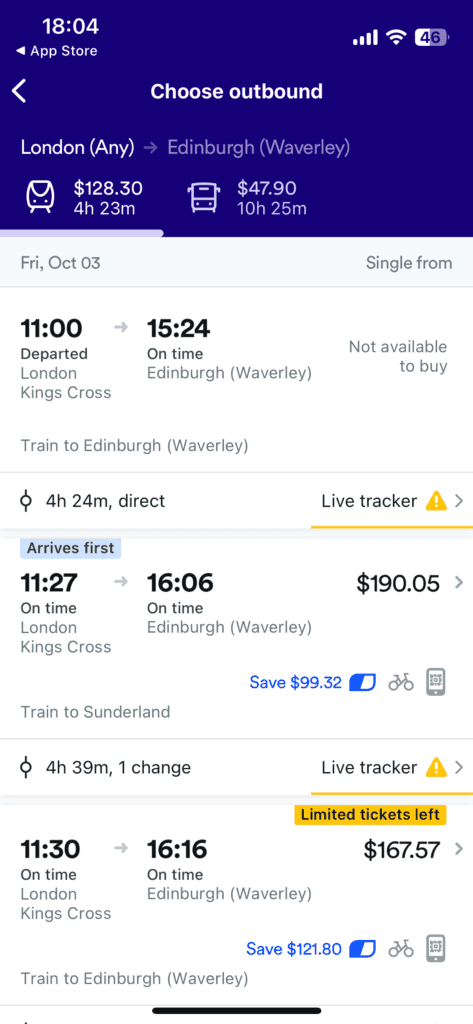 個人之所以會一直使用 Trainline 的原因在於只要輸入好搭乘時間,它就會直接整合好最便宜、最快的火車班次,同時資訊也會寫得很清楚。