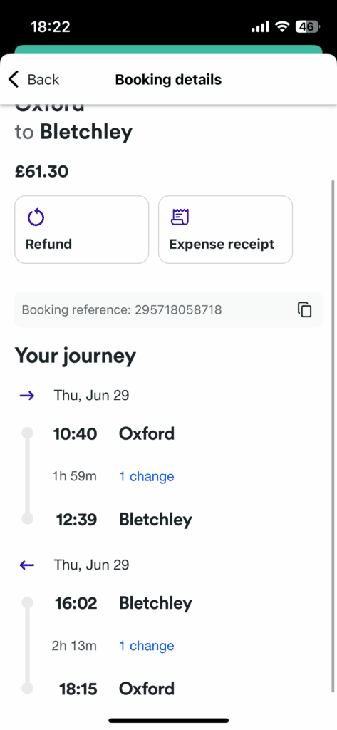 上圖是我之前使用過後的票券資訊,在這裡可以看到幾點幾分列車在哪個車站,值得注意的是中間有一個 “1 change” 藍字,意思是中間要換火車。點進藍字後,也會出現要換哪一班火車的資訊~