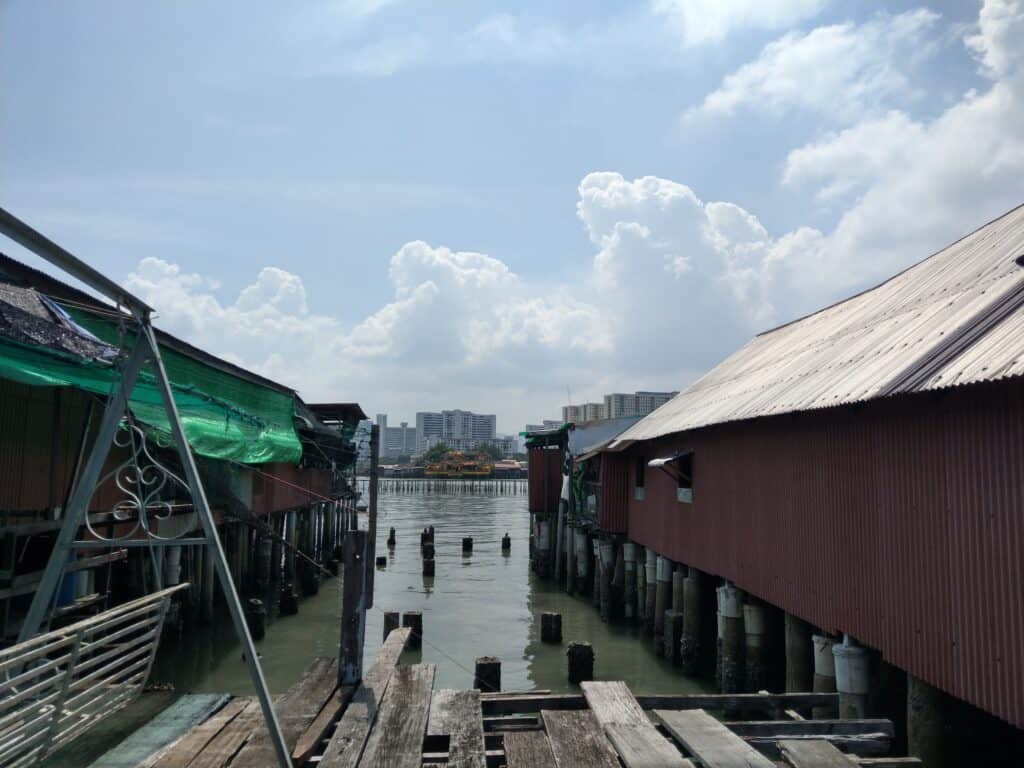 姓氏橋很特別,走在那層層木板下可以看到海,旁邊就是搭建的屋子。