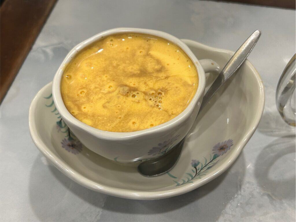 綿密的雞蛋和咖啡的結合,確實味道很特別。蛋讓咖啡很滑順,而且讓咖啡的苦味沒那麼明顯,至於這樣的味道,喜不喜歡就是見仁見智了,身為平常不喝咖啡的人,覺得沒什麼苦味還不錯,不過喝完會覺得很有飽足感。