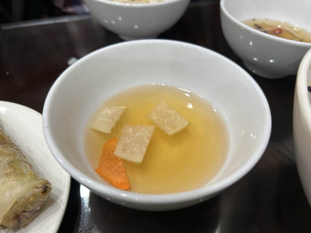在上菜之前,老闆會送一大碗飯和三道小菜來,順便示範和餵食你(可以示意這階段就不用了)怎麼吃那一碗生菜,基本上就是夾生菜去伴醬料,醬料會是酸酸甜甜的味道,最後還有一道湯。