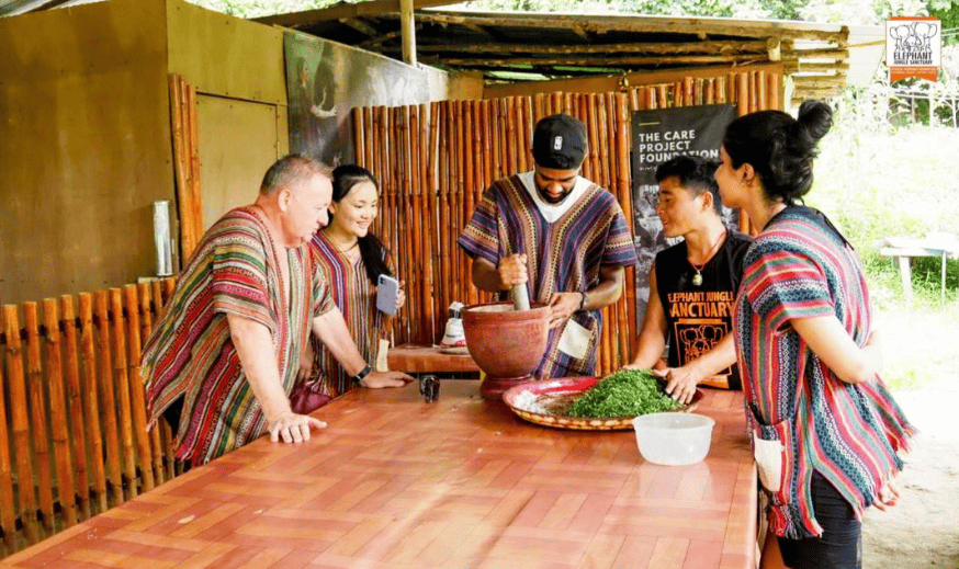 簡單介紹完大象的習性後,嚮導接著會帶大家製作大象藥草球,將香蕉、大象營養品搗碎後,做成球的形狀。做好這些藥草球後,之後會拿去餵大象