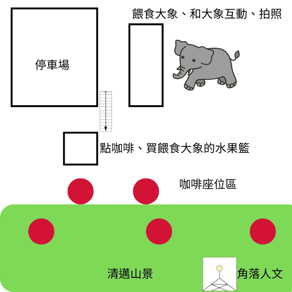 咖啡廳的空間規劃為 咖啡座位區 及 大象餵食區,兩者是分開的。畫個簡單的空間圖如下: